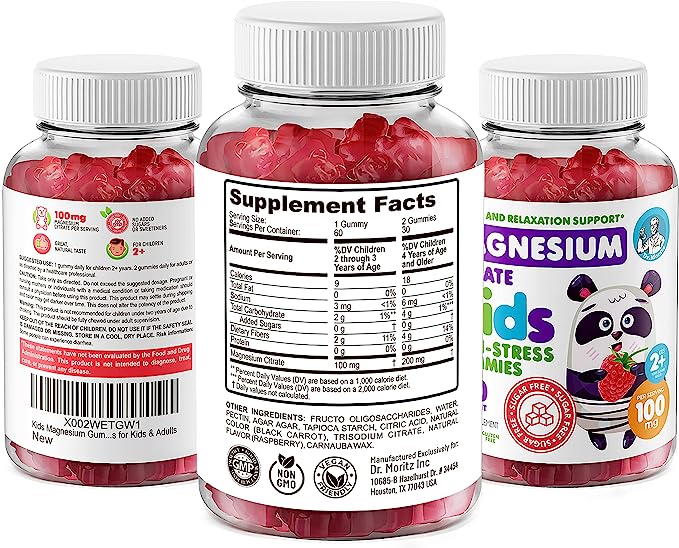 Dr. Moritz Citrato de Magnesio, 60 Gomitas Calmantes para Niños y Adultos Sin Azúcar, Suplemento , Sabor Frambuesa
