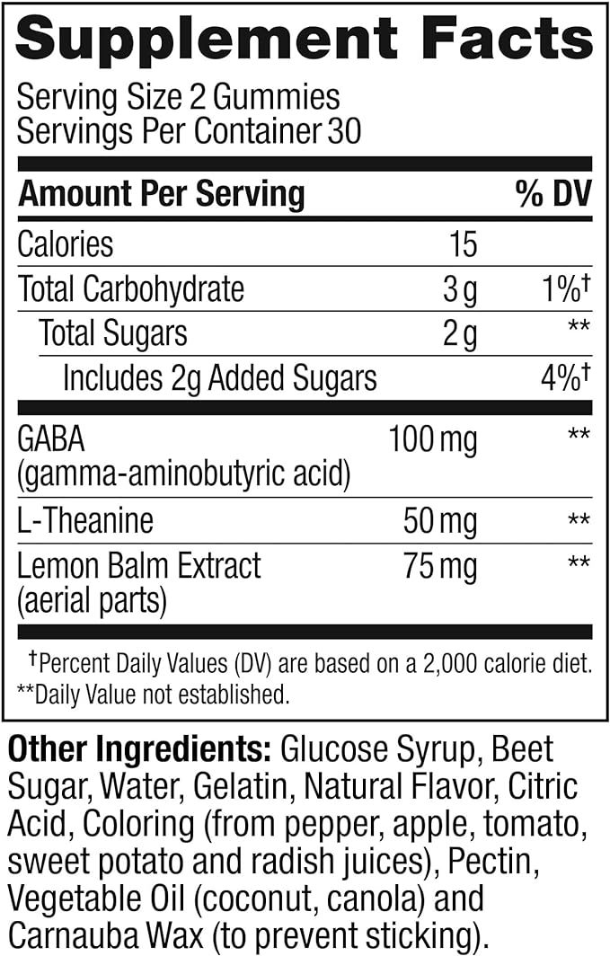 – COMPONENTES CLAVE: Contiene GABA, un componente de acción rápida que favorece la tranquilidad mental. La L-Teanina, compañera de GABA, es eficaz en el cerebro para conservar la calma, y se complementa con el bálsamo de limón, una hierba calmante.
